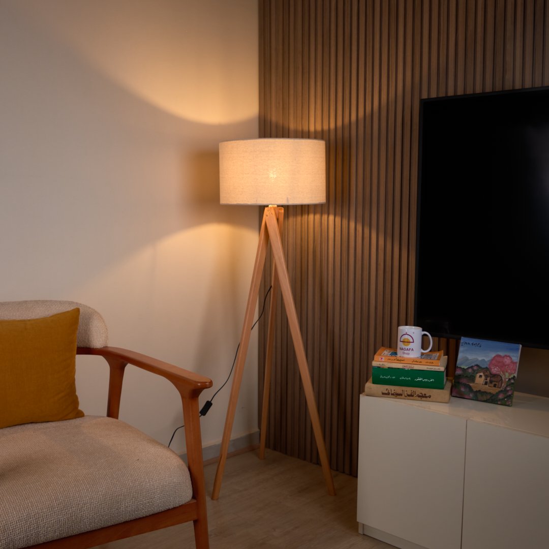 أباجورة أرضية مودرن بقاعدة خشب زان وشابوه كتان بتصميم (لمبادير مودرن) أنيق يناسب جميع الديكورات | نجفة شوب